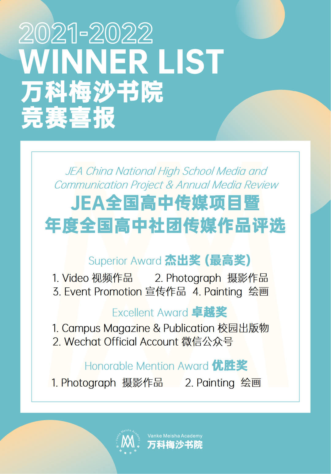 JEA China Media Review(全国高中传媒项目评选)是美国高中传媒竞赛在中国地区的赛事,Media Review在中国开创作品评选的形式,是国内中学领域最权威、参与最广泛的国际传媒赛事。全国高中传媒竞赛暨社团传媒年度评选,传媒类作品(社刊、公众号、宣传片等)或校刊、杂志、报纸、视频、电影等均可参与。
